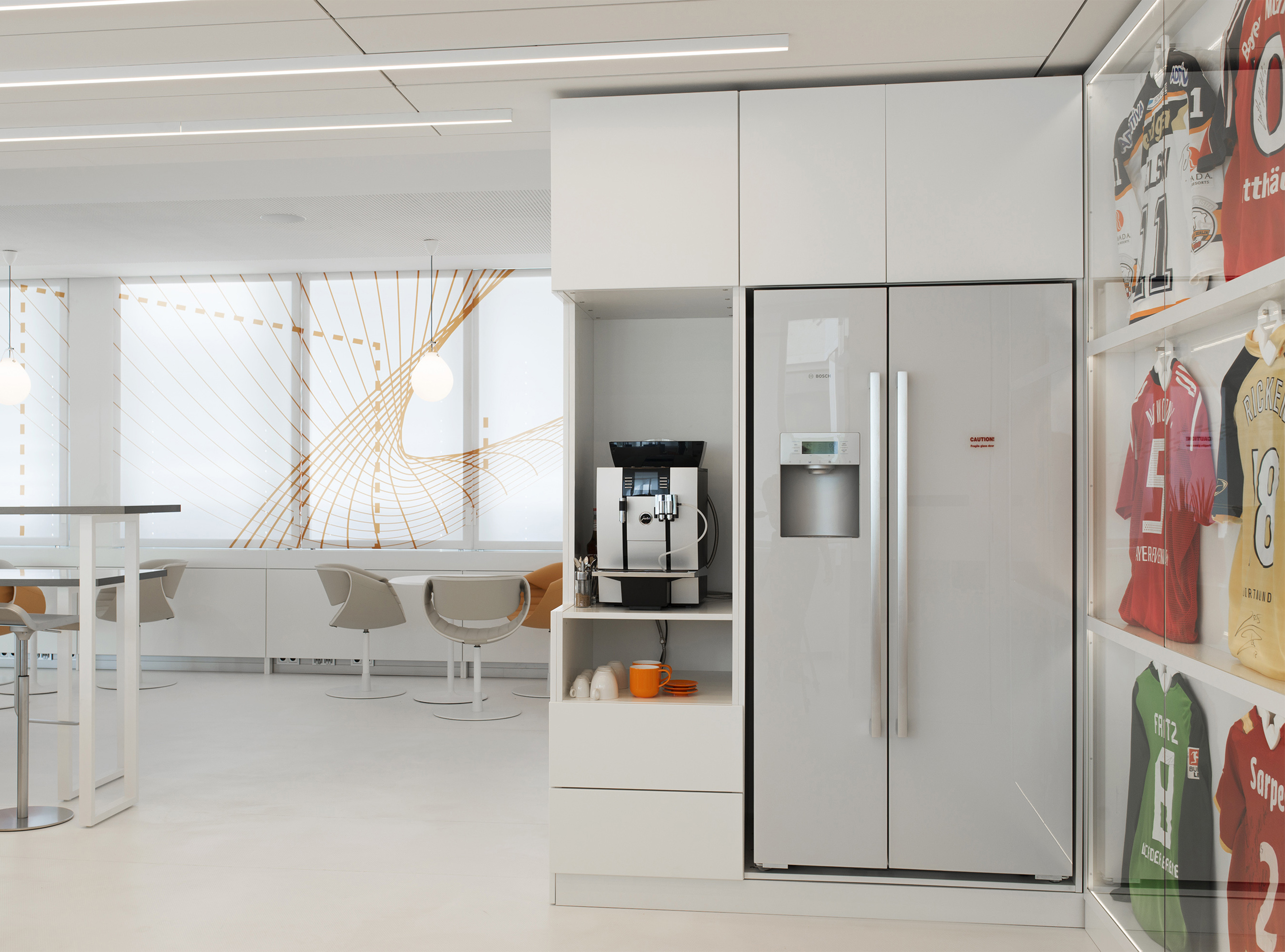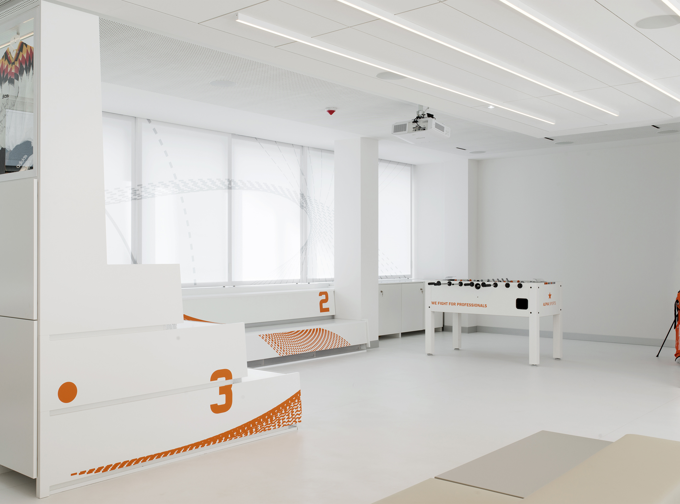 Ob als intuitives Leitsystem auf Wänden, als Sichtschutz für die Glaswände oder als thematische Fortsetzung auf Tribüne und Schiebelementen für die Verdunkelung: Das Bildkonzept für die neuen Büroräume